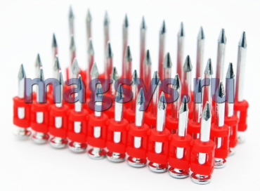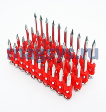 У гвоздей переменная толщина тела - основная часть тела гвоздя имеет диаметр 3,05 мм и далее путем технологии редуцирования оно сужается до диаметра 2,7 мм. Жало у гвоздя - резанное. Почему применяется эта технология? Гвозди большого диаметра испытывают большее лобовое сопротивление при вхождении в материал, а также создают большее напряжение в материале, что увеличивает количество возможных сколов и разрушений в материале. Редуцированное тело обеспечивает более "мягкий" вход в материал, увеличивая качество пристрелки к сложным поверхностям. Основное тело гвоздя диаметром 3,05 мм в свою очередь уменьшает последствия воздействия изгибающей нагрузки при забивании гвоздя в твердый материал.