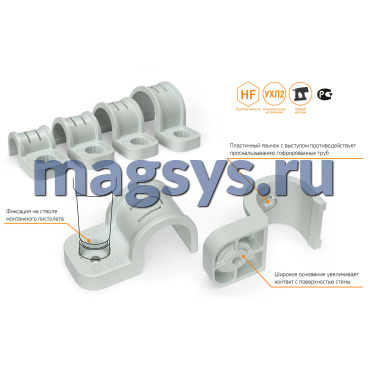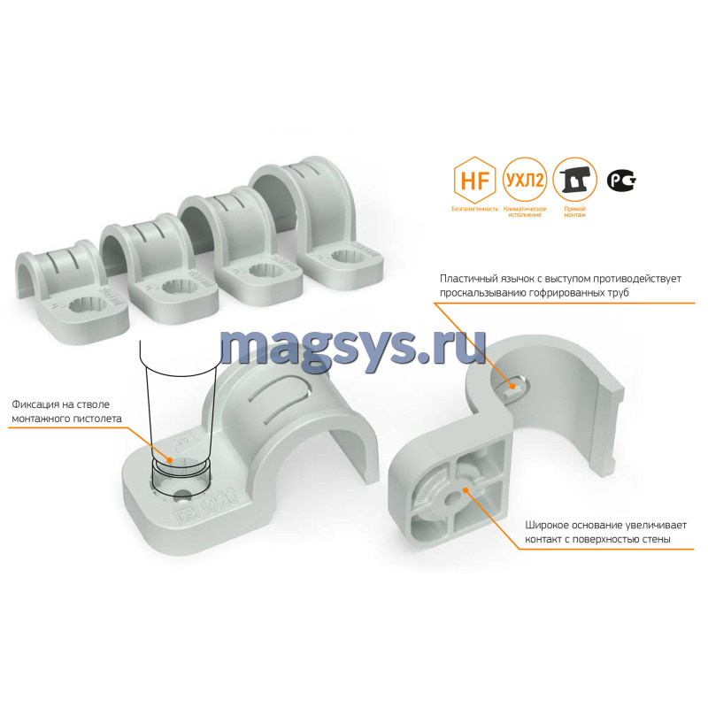 Клипсы для труб Промрукав предназначены для монтажа проводки в гофротрубах, монтажа водонапорных труб и прочих работ по прокладке сетей, требующих использование труб. Крепеж клипса позволяет существенно сократить время монтажа за счет использования газового монтажного пистолета для моментальной фиксации в бетоне, кирпиче и даже металле. Клипсы легко закрепляются на стволе монтажного пистолета и придерживать их рукой при монтаже не требуется.
