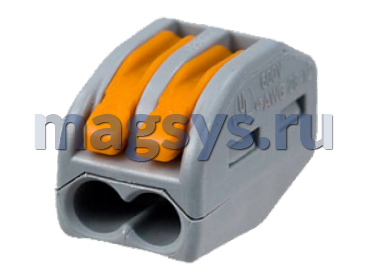 Клеммная колодка 2-х контактная из серии 222 с нажимным рычагом для медных одножильных и многожильных проводников. Изготовлена из пластика, две половинки корпуса фиксируется на защёлках, рычаги, внутри скобы которые зажимают провода при опускании рычагов. У этого способа скрепления есть ряд преимуществ: высокая скорость соединения, надежность и удобство дальнейшей работы с проводами, их обслуживания.